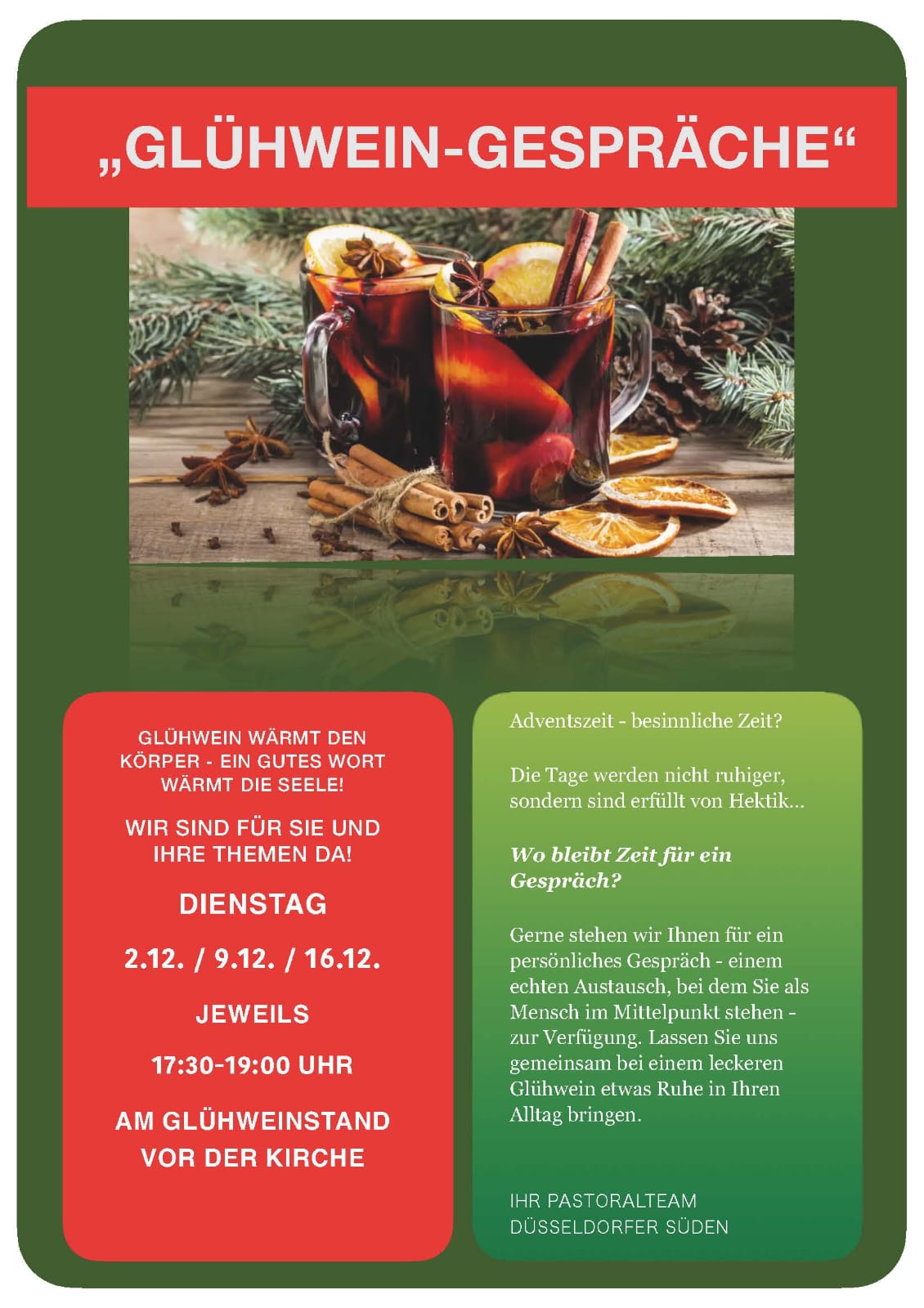 ist ein Mitglied unseres Seelsorgeteamsaoder auch mehrere am Glühweinstand vor der Kirche St. Cäcilia in Benrath